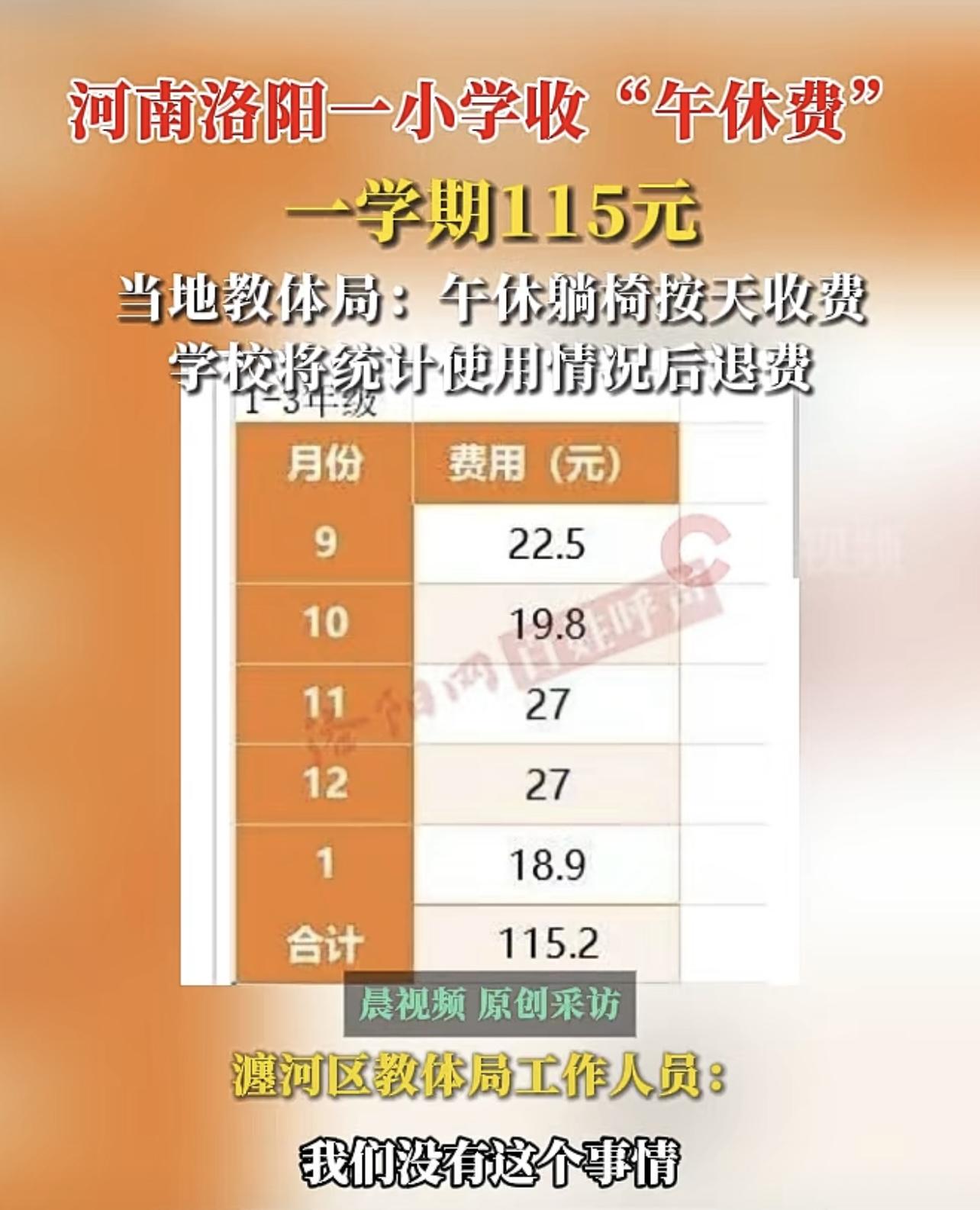 11月3日,洛阳市瀍河区教体局称:经了解,君河湾小学非寄宿制学校,根据大部分家庭实际情况,为满足学生中午在校能够躺下午休的需求,经学校多方联系协调,由第三方单位免费提供午休椅,每天需缴0.9元的使用费。如果家长不需要,学校可以安排学生在教室午休。